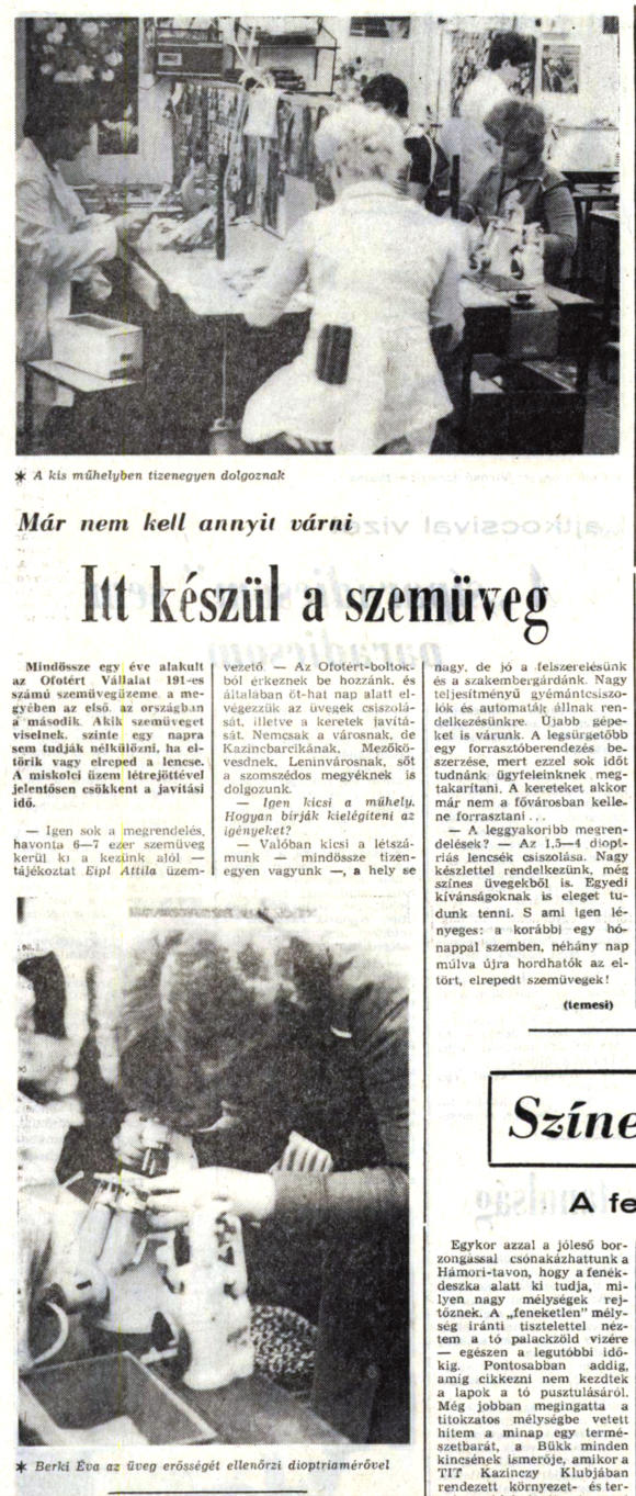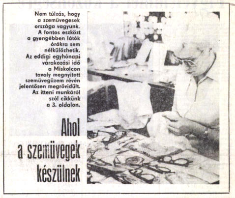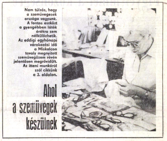 Déli Hírlap 1984. február 20. Nem túlzás, hogy a szemüvegesek országa vagyunk. A fontos eszközt a gyengébben látók órákra sem nélkülözhetik. Az eddigi egyhónapi várakozási idő a Miskolcon tavaly megnyitott szemüvegüzem révén jelentősen megrövidült. Az itteni munkáról szól cikkünk a 3. oldalon. Ahol a szemüvegek készülnek